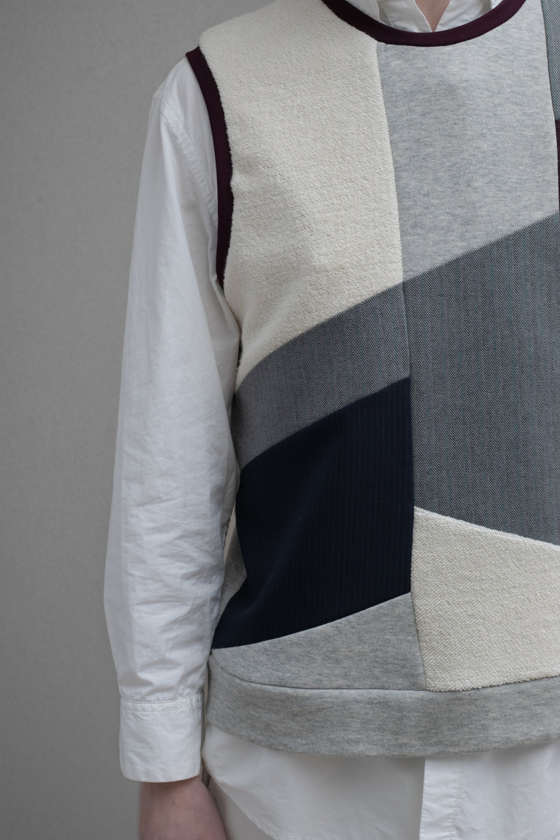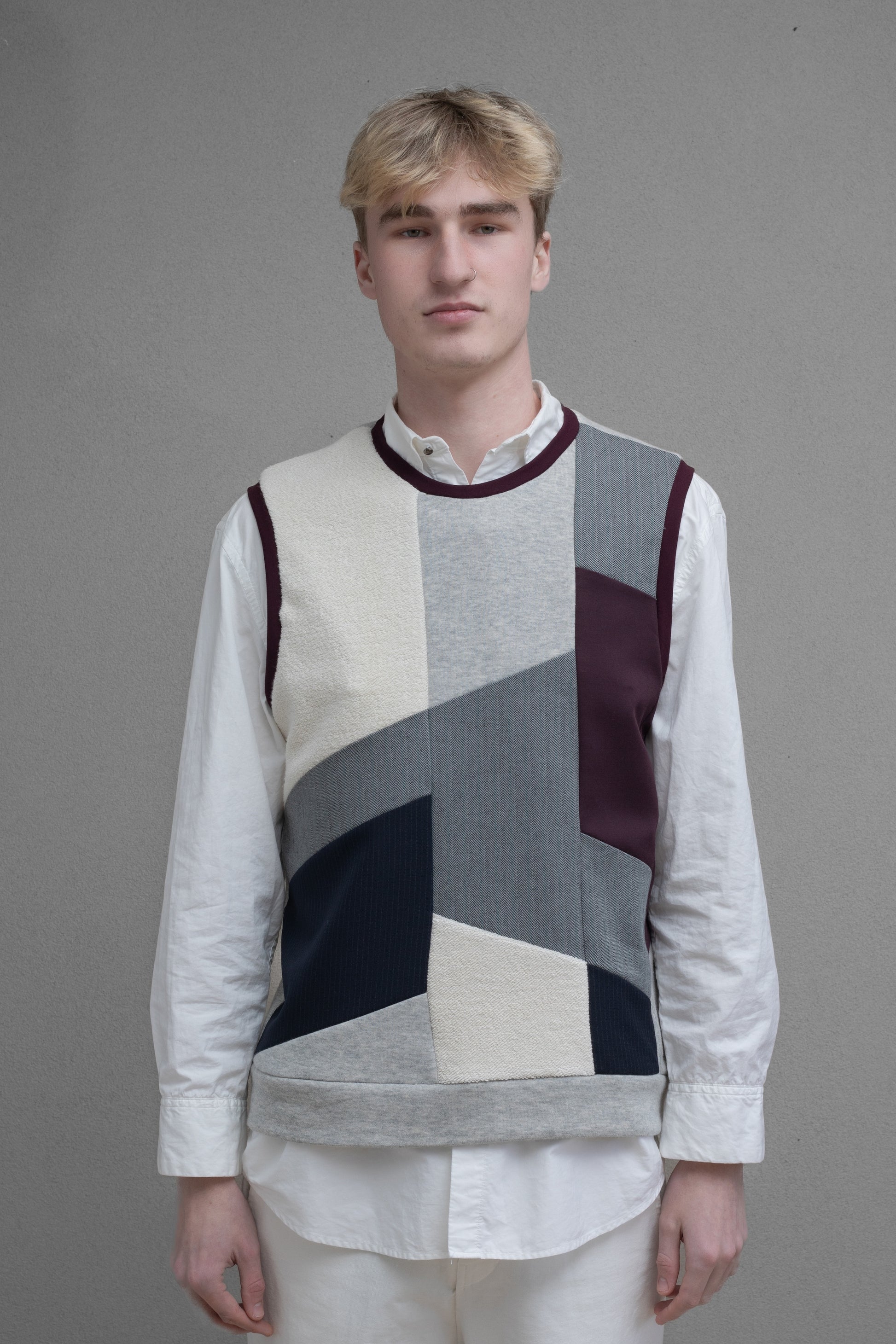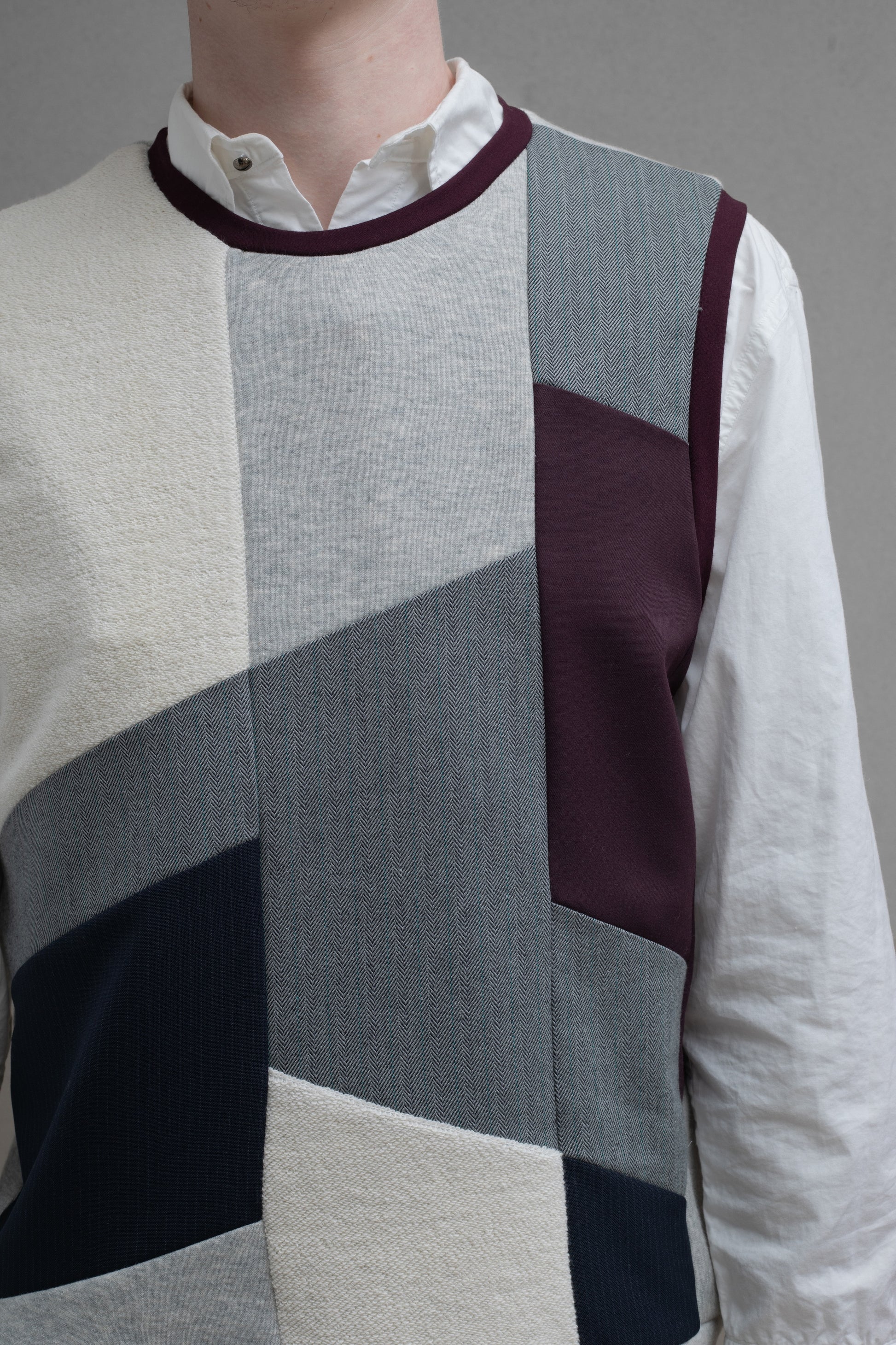 - Front panel of geometric inserts of mixed fabrics and patterns (Cotton/wool herringbone , navy pinstripes, reverse terry and burgundy crepe)