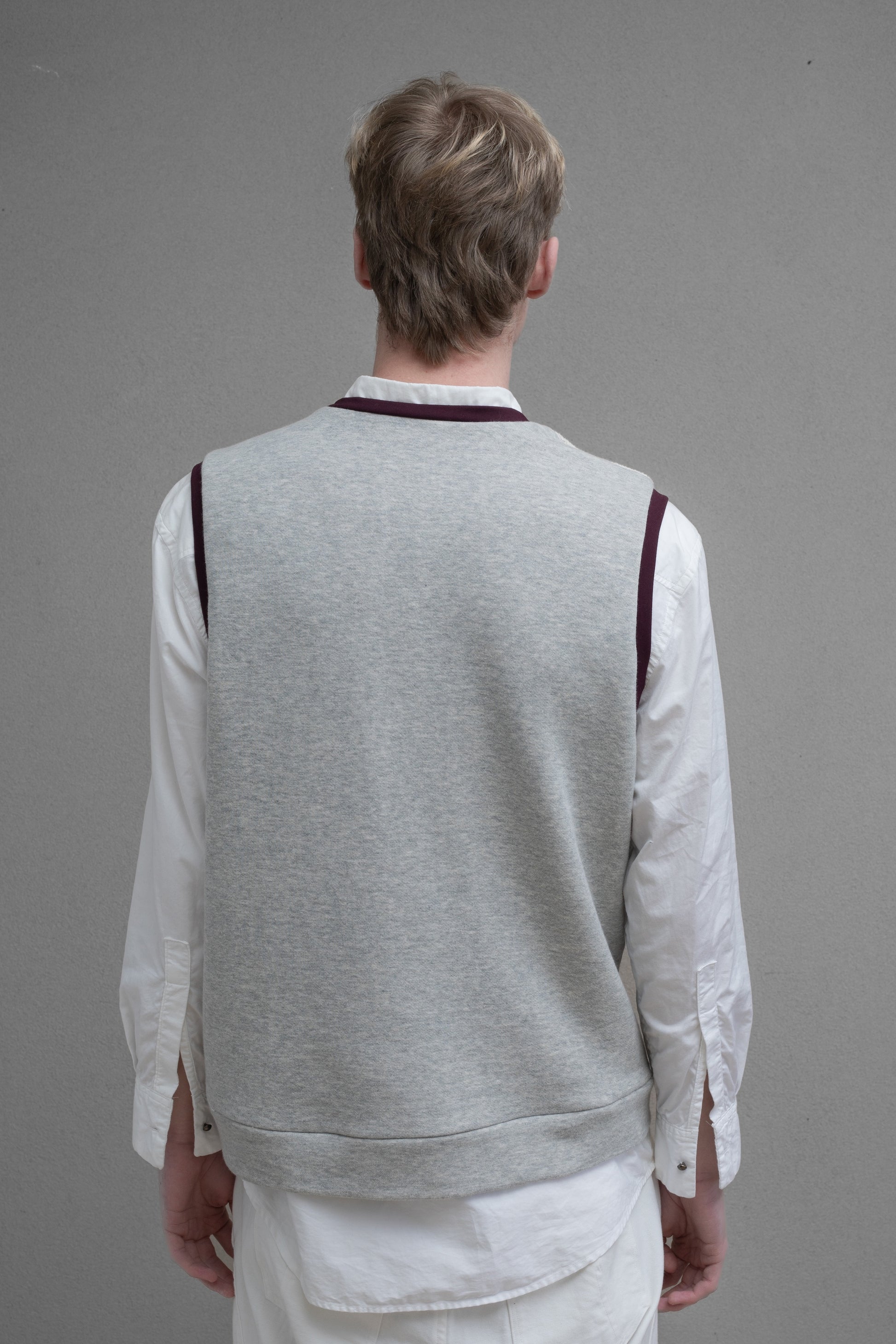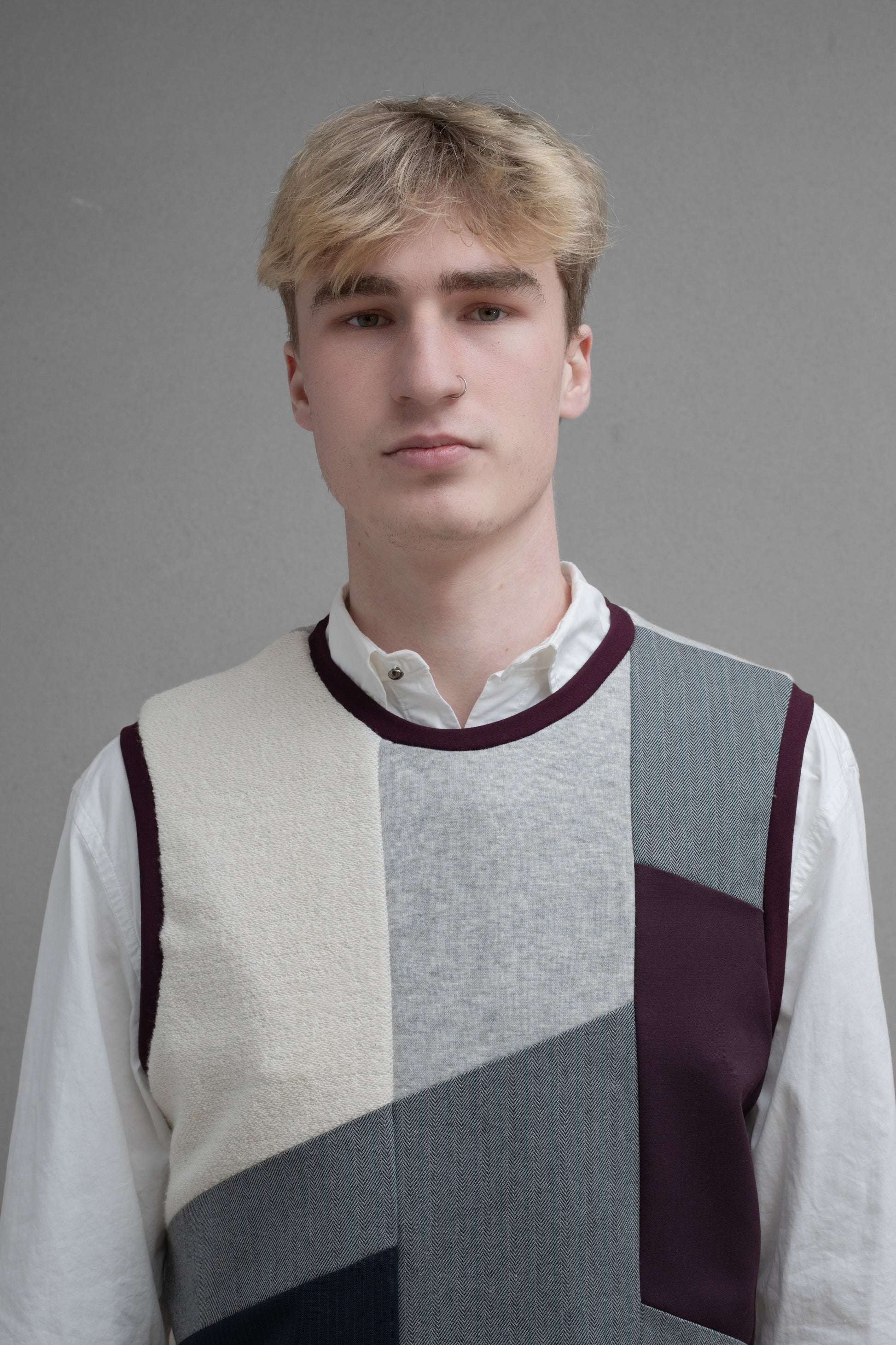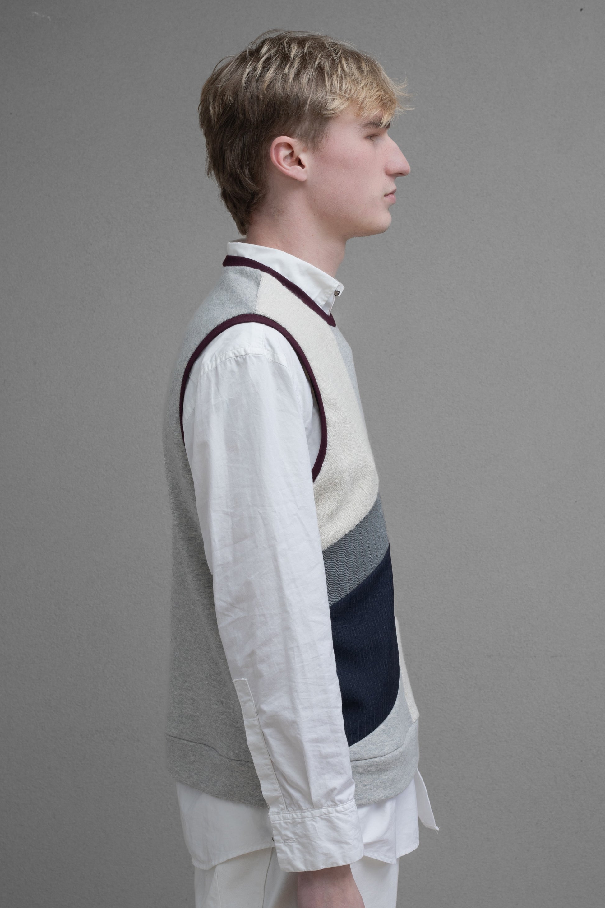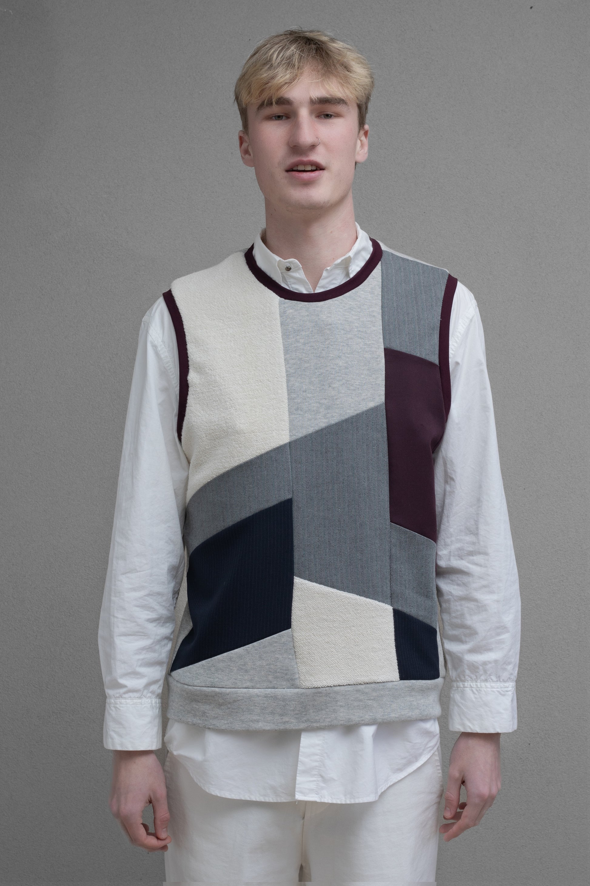 - Front panel of geometric inserts of mixed fabrics and patterns (Cotton/wool herringbone , navy pinstripes, reverse terry and burgundy crepe)