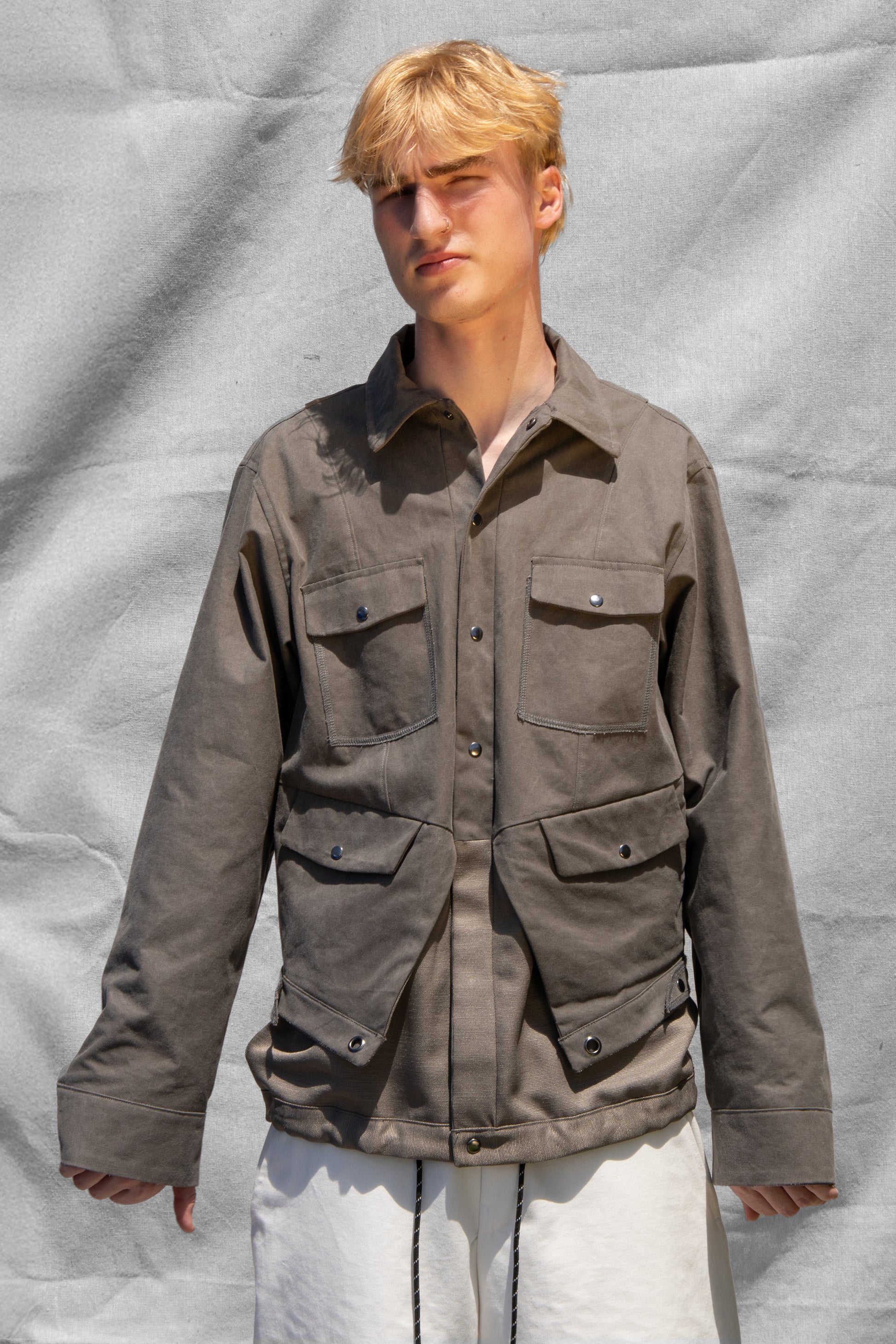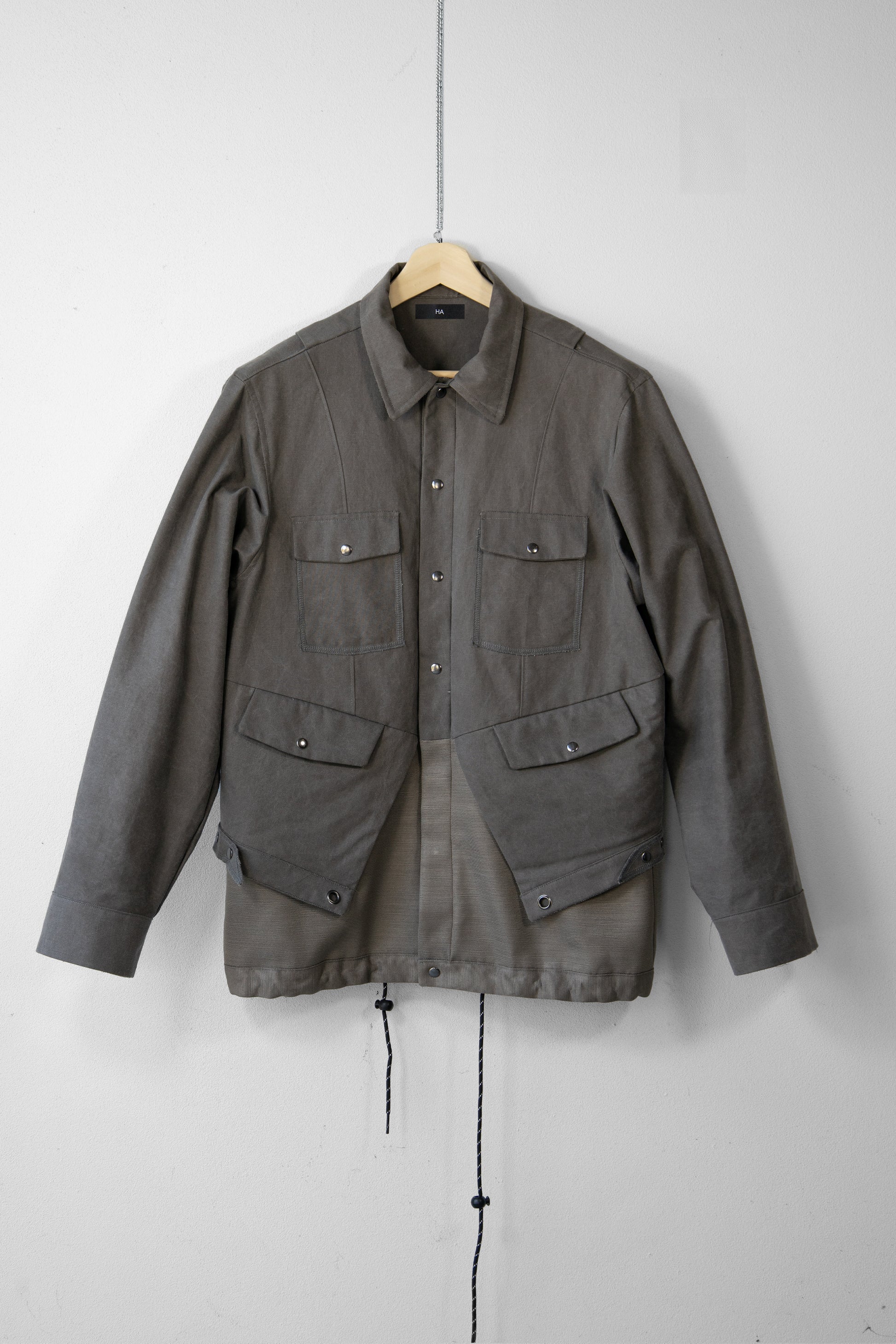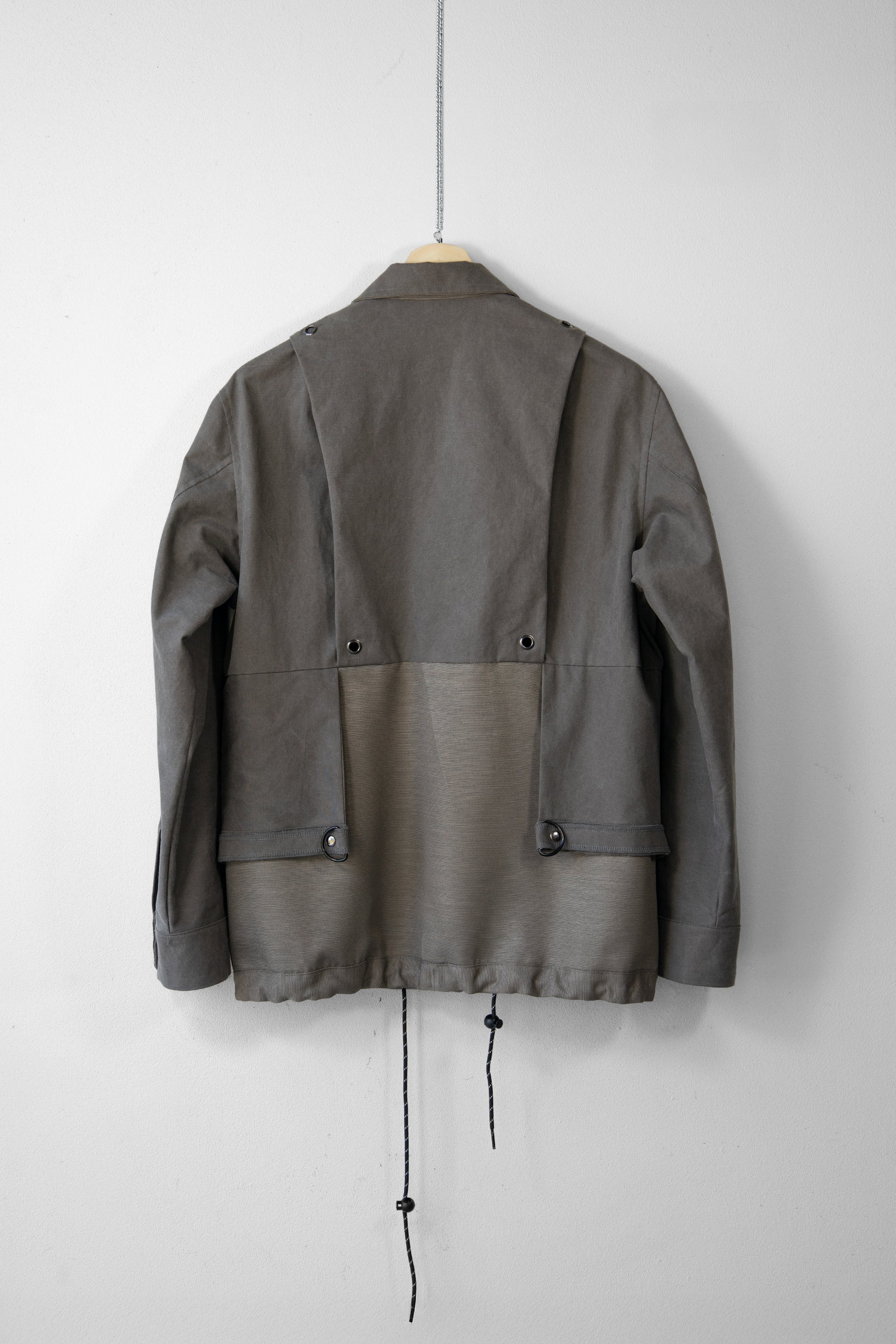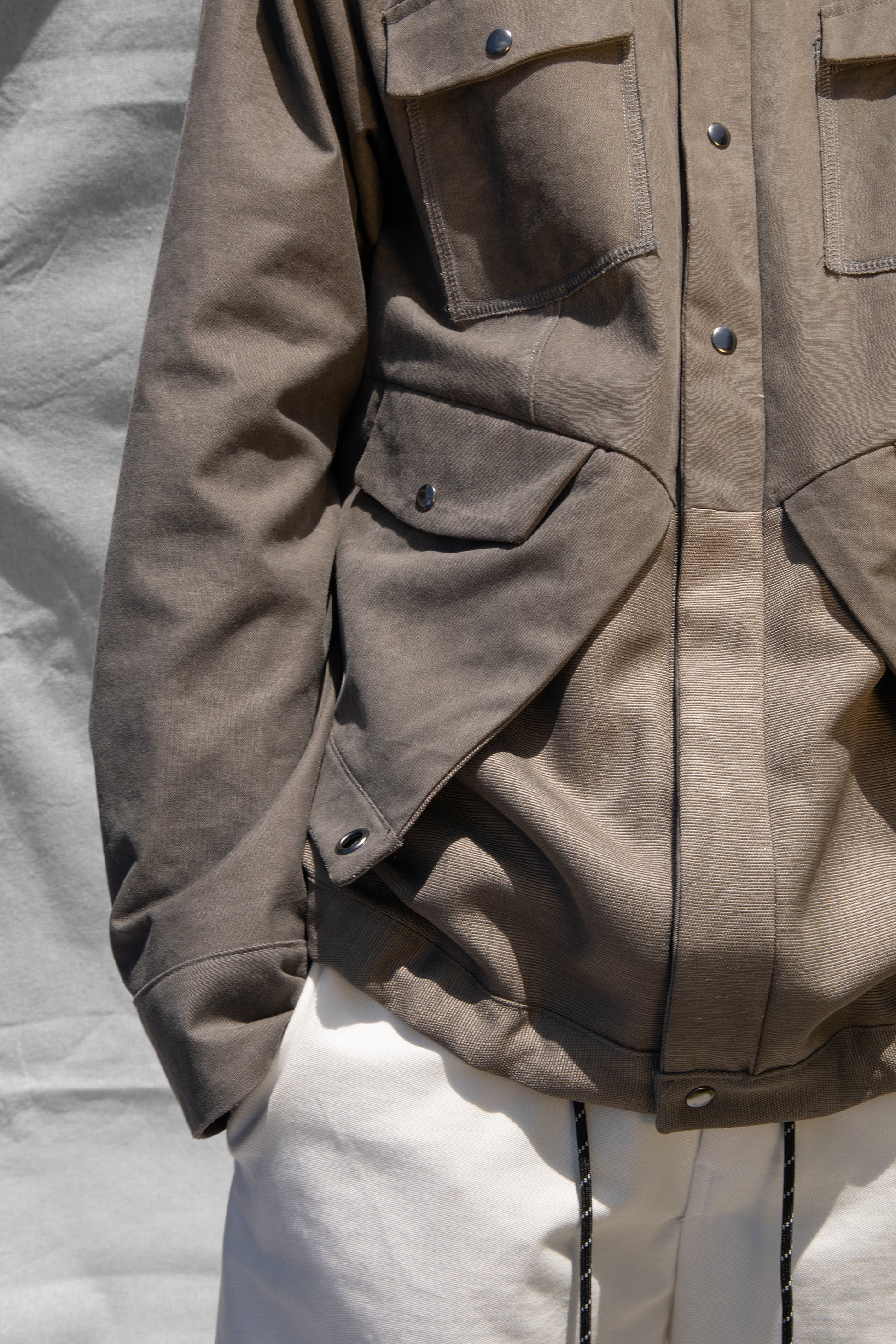 - Main body in cotton canvas with off centre slanted hip panels with in seam pockets extending to quarter back panel with fixed hem band straps and d-ring detail