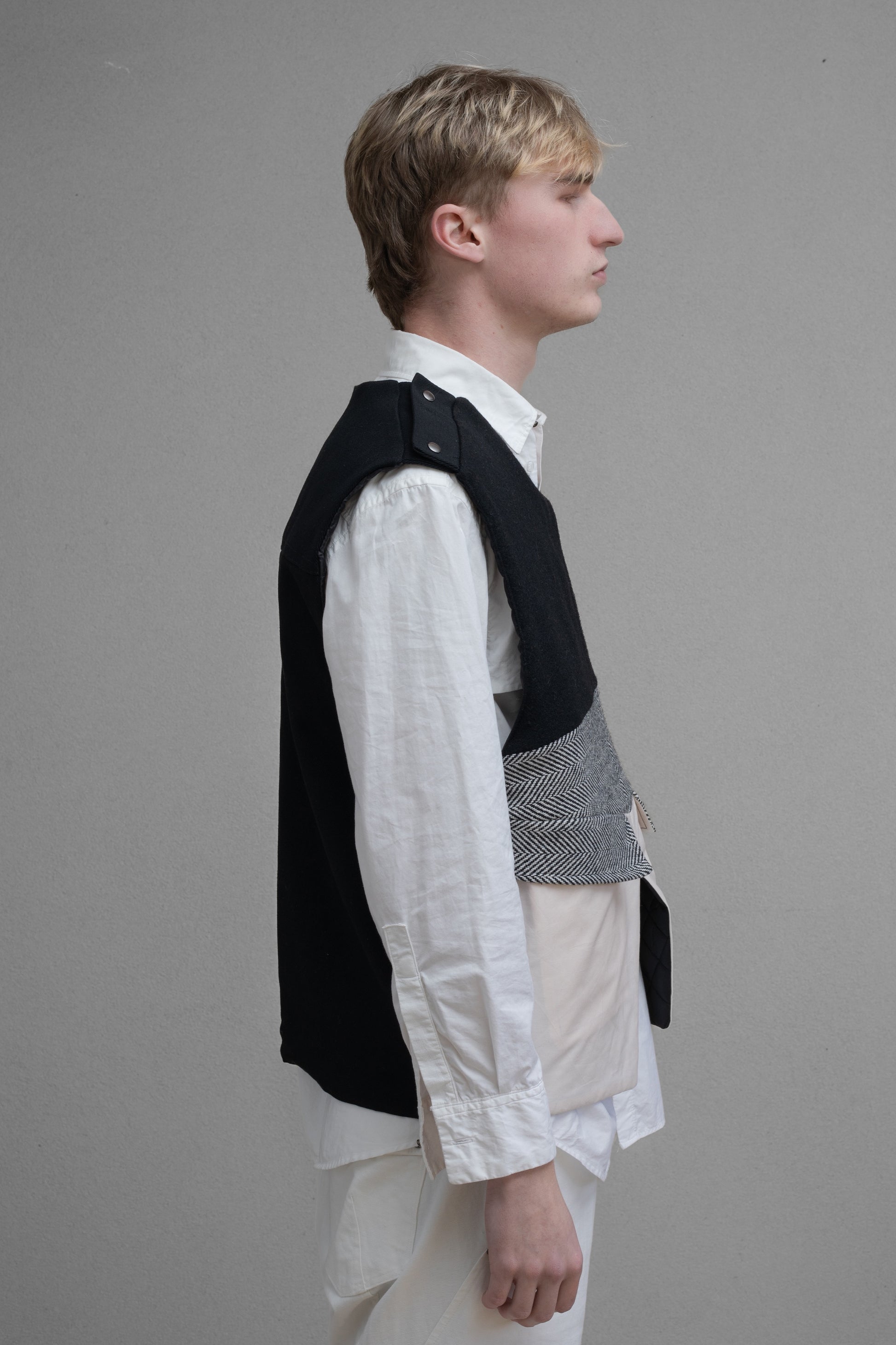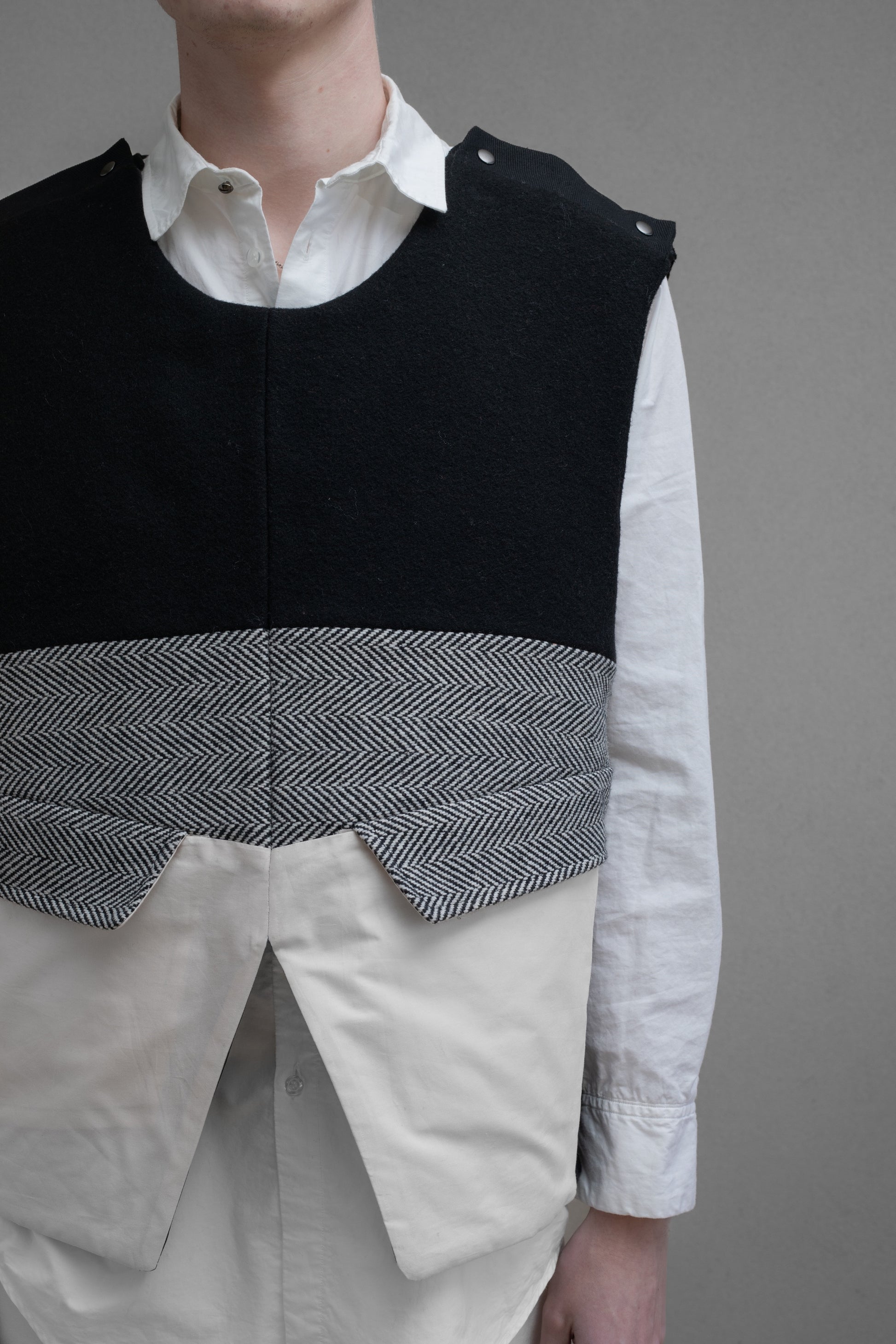 - Multi panelled front of deadstock wool herringbone, felted wool and poplin with quilted lining